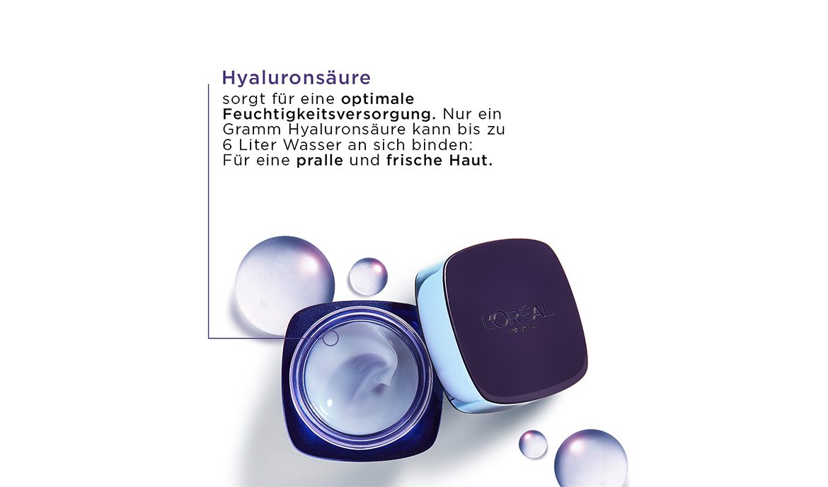 Nach der Reinigung empfiehlt sich ein Serum mit Lifting-Effekt. Das Revitalift Filler Anti-Falten Serum von L’Oréal Paris mit Hyaluronsäure und wirkt den Anzeichen der Hautalterung gezielt entgegen. Hyaluron spendet Feuchtigkeit und sorgt für eine frische Ausstrahlung. Gleichzeitig regt Adenosin die Kollagenproduktion an.