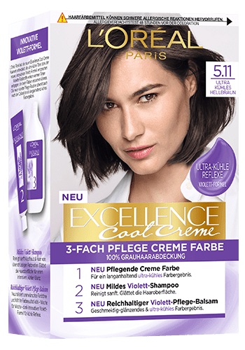L'Oréal Paris hat die neuen Excellence Cool Creme Nuancen mit 3-Fach Pflege entwickelt, die ultra-kühle Töne dank der innovativen Anti-Gelbstich / Violett-Formel versprechen. Violette Farbstoffe wirken warmen Tönen entgegen, die beim Färben entstehen können. Die neue violette Pflege-Routine schenkt auch nach der Coloration ein langanhaltend kühles Farbergebnis.